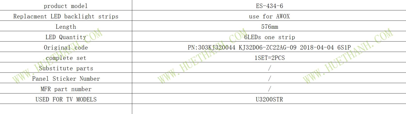 Hãy là người đầu tiên nhận xét “LED TV Backlight use for AWOX PN:303KJ320044 KJ32D06-ZC22AG-09 2018-04-04 6S1P”