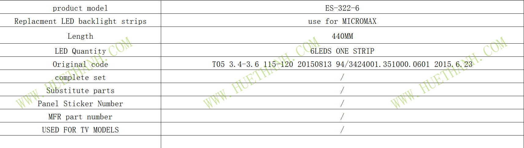 Hãy là người đầu tiên nhận xét “LED TV Backlight use for MICROMAX 6LEDS T05 3.4-3.6 115-120 20150813 94/3424001.351000.0601 2015.6.23 LED STRIPS”